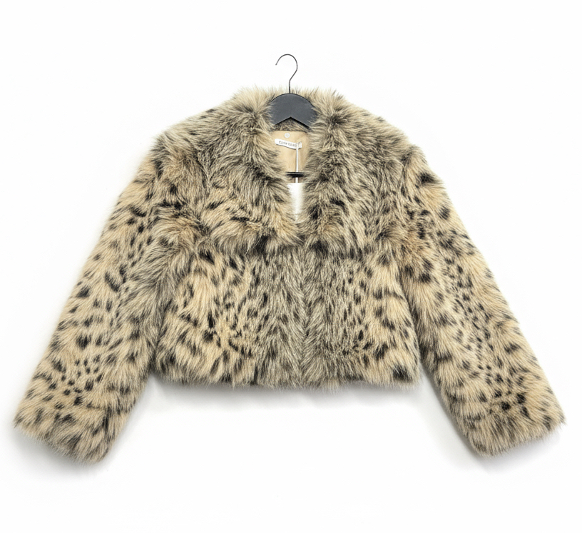 Chaqueta corta de pelo sintético de alta calidad con textura suave. Diseño de cuello redondo, manga larga y cierre oculto en la parte frontal. Forro interior para mayor confort y combinado con piel. Una prenda versátil y elegante, ideal para combinar con pantalones de vestir, faldas o jeans en looks de día o de noche.