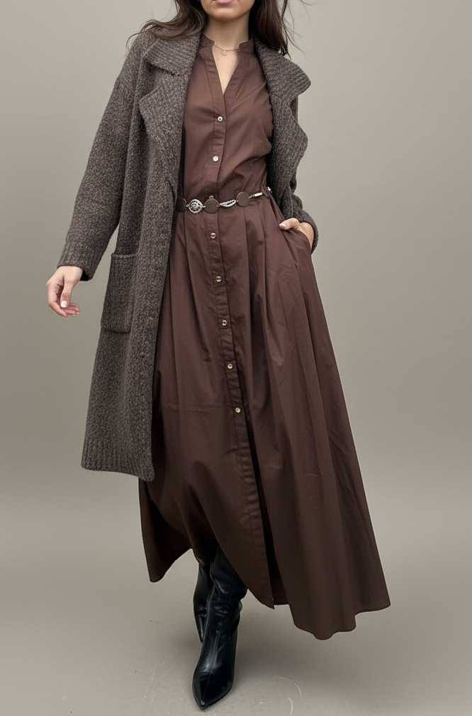 Vestido midi confeccionado en hilatura con mezcla de algodón. Cuello redondo y escote pico. Detalle de pinzas delanteras y cinturón cadena.