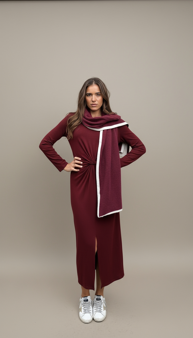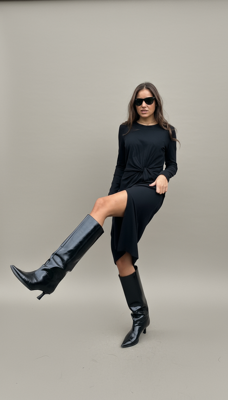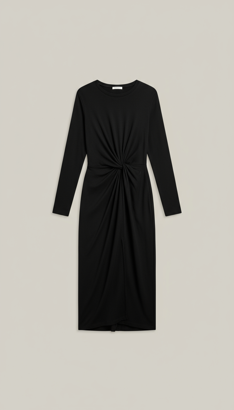 Vestido midi de punto y de manga larga. Frunce tipo nudo en la cintura y abertura frontal.