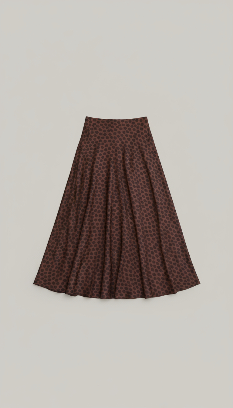 Falda midi confeccionada en tejido satinado con un sutil brillo y estampado geométrico en tonos engamados. Su corte evasé favorece la silueta y aporta movimiento con cada paso. De cintura alta y sin cierre visible, ofrece un ajuste cómodo y elegante.